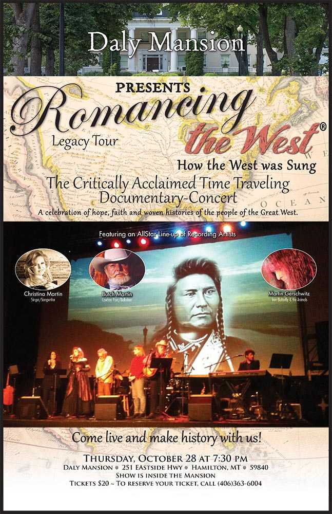 Romancing the West: How the West was Sung is a critically acclaimed “time-traveling” documentary concert that attendees will get to enjoy in the Living Room of the Daly Mansion! Performers include singer/songwriter Christina Martin, cowboy poet Butch Martin and Martin Gerschwitz of Iron Butterfly and the Animals.